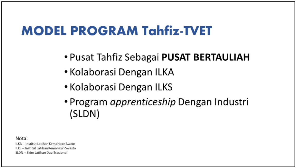 - Program TVET merupakan nilai tambah (added value) kepada program Tahfiz sediada untuk meningkatkan imej dan penjenamaan institut Tahfiz dan terlibat dalam kerangka pembangunan modal insan negara.